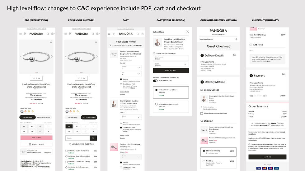 As the only UX/UI designer designated for this challenge at Pandora, my role was to uncover user needs and align them to business goals and outcomes relating to click & collect end-to-end journey. By following the double diamond methodology of divergent and convergent design thinking, I aimed to create a seamless user experience that effectively captured the brand's essence and elevated its digital presence.